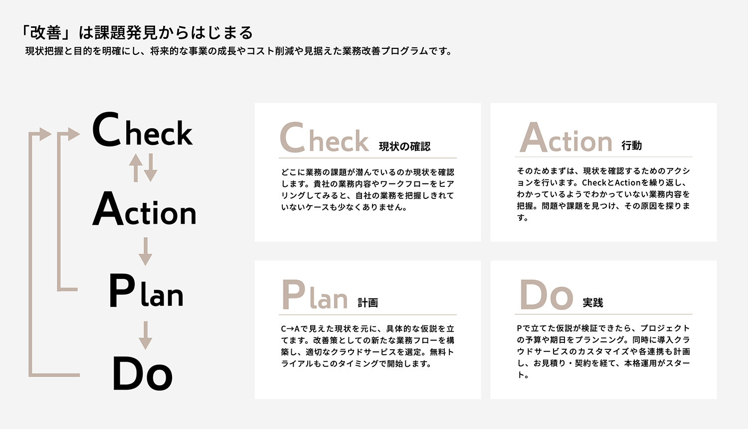 キャップドゥー・ジャパンは特に、現状を把握し課題に気づくステップを重要視し、「課題発見」から始まる業務改善プログラムを用意しています。