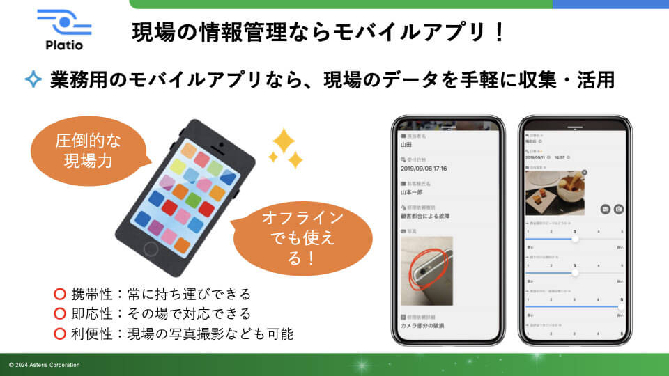 現場の情報管理における課題を一気に解消できるのが、業務用モバイルアプリです。