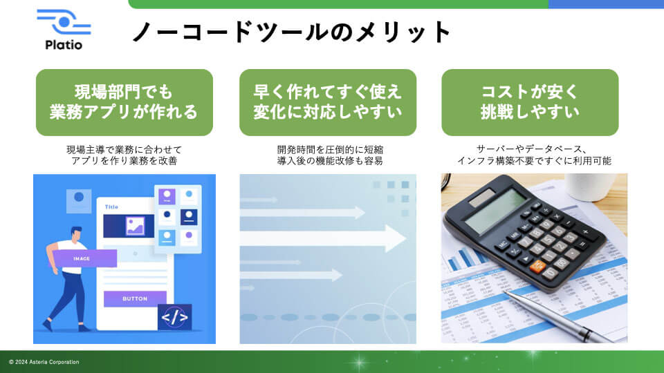 ノーコードツールを活用することで得られるメリットは主に3つあります。
