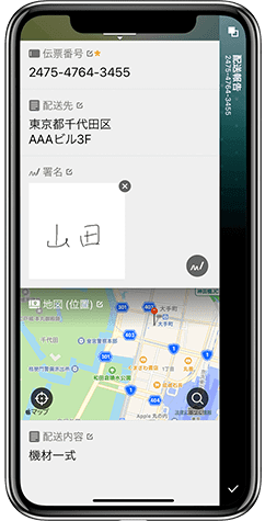 荷物配送時に配送先の位置情報と配達先の受取人の署名を記録することができます。