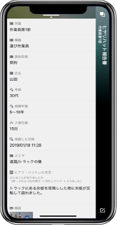 - 現場で発生した危険箇所を記録し、リアルタイムに情報共有することができます。また、ヒヤリハット報告を蓄積することで今後の対策にも役立ちます。